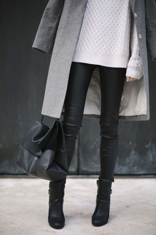 Štíhlé nohy vypadají v přiléhavých kalhotách ještě štíhleji. A kontrastují k objemnému kabátu a svetru.