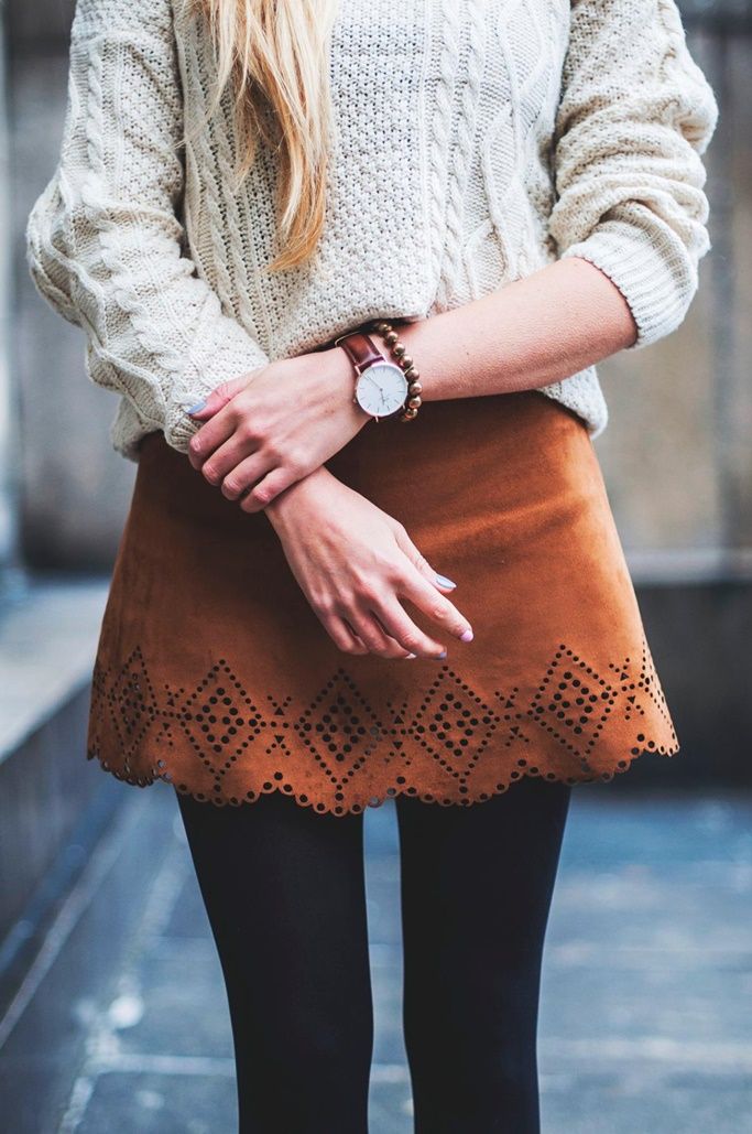 Kdyby místo hrubého pleteného svetru oblékla obtažený top, pak by mohla vypadat „trochu vulgárně“, jak jsem zmiňovala výše. Široký svetr je zde to pravé ořechové! (Také pánské hodinky umí dobře „stáhnout“ případnou přílišnou infantilnost minisukně.)