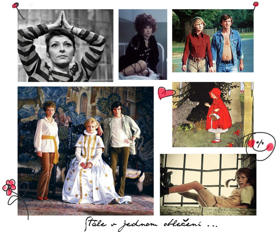Janu Štěpánkovou v seriálu Taková normální rodinka, která prakticky toto jógové pruhované triko nesundá. Saxany černý „outfit“ včetně šperku a bot se stal legendárním. Ve filmu Léto s kovbojem jsou oba také téměř celý film v jednom. Kolářová občas zamění košili za tričko, ale Hanzlík snad tento „nahý“ model džísky vůbec nesvlékne. V Arabele má Jana Brejchová, byť je to královna celé říše pohádek, stále jen tyto bílé šaty, Petr Majer a princezna Arabela jakbysmet. A Červená karkulka? Tam je to naprosto jasně dané. Je Červená, protože nosí červený čepeček. Z každodenního oblečení se stává její nejvýraznější poznávací znak, díky kterému získala i své jméno. No a poslední Pipi. Kde by byl její půvab a charisma, kdyby nosila každý den jiný model? (Více o Pipi také zde.)