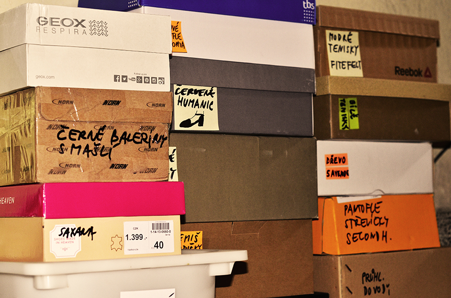 - Několik párů, které zrovna často nosím, mám v chodbě v botníku. Ostatní, mimosezónní či příležitostné, ukládám v původních krabicích, aby byly chráněné proti prachu. Pokud z krabice není zřejmé, o jaký pár se jedná, nalepím na ni stručný popisek.