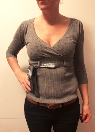Odhaduji, že žena nabízející toto šedé sako si pravidelným cvičením vyformovala tzv. testosteronovou postavu – tedy úzké boky a výraznější horní část. Jenže tím, že na takový hrudník ještě oblékne světlé sako s otevřeným výstřihem a zkombinuje s velmi těsnými, obtaženými džínami, jen svou neproporčnost zvýrazňuje.