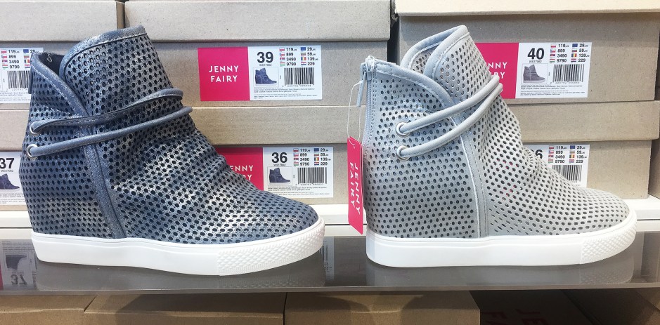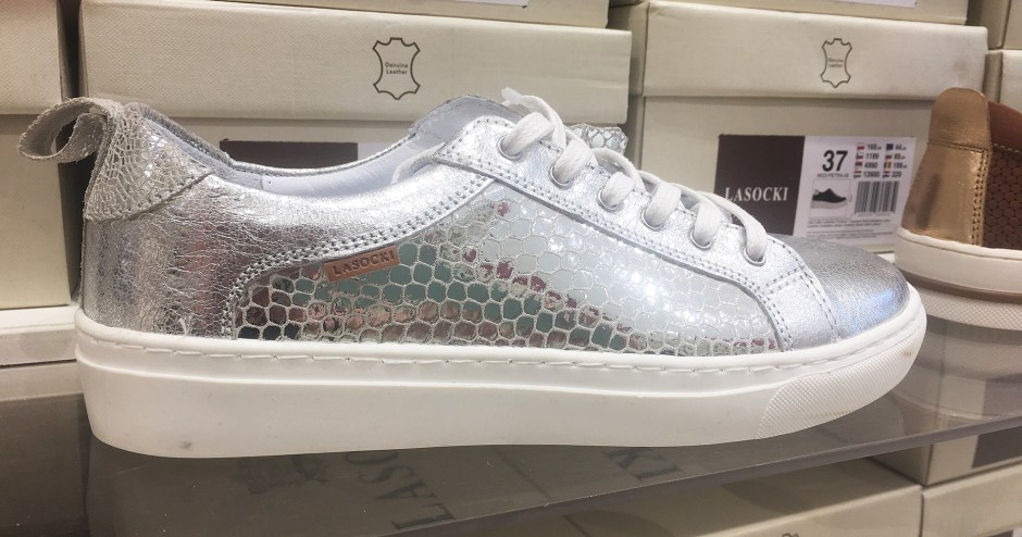 Ale snad úplně nejhorší je tohle – tenisky na klínu. Tenhle typ bot je paskvil už ve svém prvopočátku. Ovšem v případě tohoto modelu je to ještě navíc zpečetěné metalickým leskem a bílou platformou, která na vše nad sebou ještě více poukazuje a podtrhuje jak mramorový podstavec pod sochou Stalina. Tohle nemůže nikdy vypadat jinak než jako „laciná kopyta“.