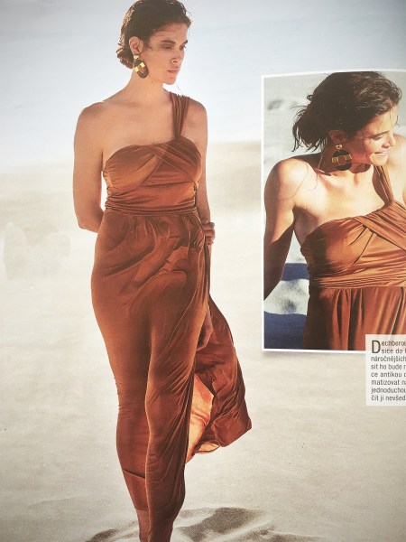 Dejme tomu, že na figuríně v obchodu zahlédnu přesně takové šaty. Šaty v barvě měděné půdy. Velmi se mi líbí a tak začnu hledat svoji velikost. Najdu ji a odcházím do kabinky. Ale zatím nevím, jestli je to pro mě dobré či ne, ale šaty mi padnou. A tak tam v nich postávám, kroutím se před zrcadlem, krok sem, krok tam, upravuji si vlasy, svůdně se na sebe usmívám …