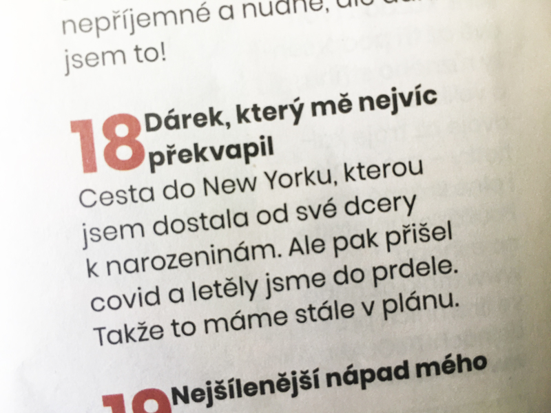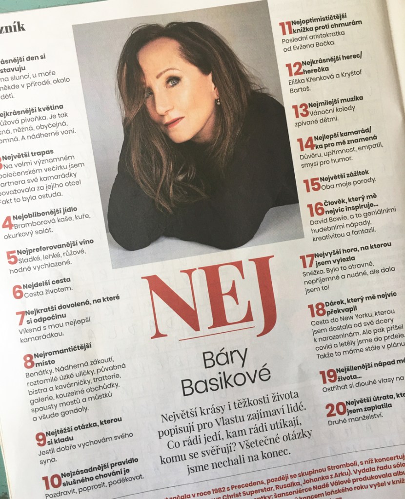 Před pár dny jsem si v naší obecní schránce na časopisy „Přečti a vrať“, u které se zastavím vždy cestou z ranní procházky, vzala jedno odložené číslo časopisu Vlasta (17/2022). Doma jsem si pak udělala kávu a posadila se s ním ke stolu. A aniž bych se na něj nějak příliš soustředila, spíš jsem jen tak zběžně listovala, pročítala nadpisy, prohlížela obrázky, až jsem došla ke stránce, zřejmě pravidelné rubrice, otázek a odpovědí známým osobám. A protože to byly otázky i odpovědi jasné, krátké a stručné, a protože v tomto čísle na ně odpovídala zpěvačka Bára Basiková, kterou jsem dříve mívala ráda (ne že bych teď neměla, jenom ji, jakožto celou populární hudbu, už dnes vlastně téměř nesleduji), tak jsem se do nich začetla.