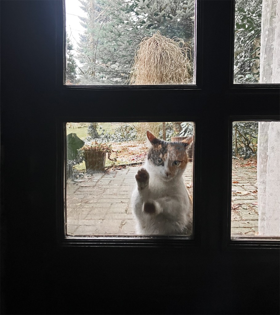 Její trůn se nachází na gauči v obýváku, který má dveře přímo do zahrady. A v tom je největší kámen úrazu. Královna naší domácnosti, klidně i desetkrát do hodiny, z gauče seskočí, postaví se ke dveřím a chce jít ven. Jenže když ji pustíme, jako by si to vzápětí zase rozmyslela. Udělá pár kroků po terase, protáhne se a začne mňoukat, že chce dovnitř. A nestane-li se tak nejpozději okamžitě, přidá ono, od své matky naučené, škrábání na dveře. Packami jezdí nahoru a dolu a s nechápavě naštvaným výrazem vrchnosti, kterou její čeládka nechce poslouchat, se domáhá vstupu.