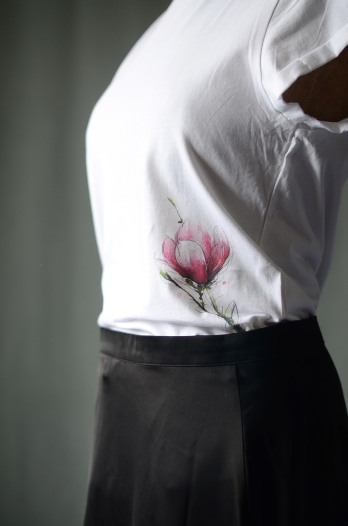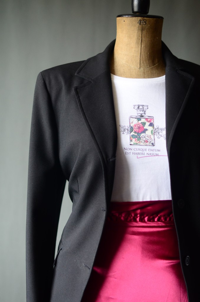 4. Nabádám a inspiruji k zajímavějšímu nošení, než jen k džínám nebo pro volný čas. Trička jsou skvělou možností jak širokým sukním odpomoci od vážnosti a přílišné romantiky, úzkým pouzdrovým sukním od upjatosti a snaživosti a černým společenským kalhotám a sakům zas obrousí hrany strohé formálnosti. (Viz příklady kombinací, které jsem vytvořila při focení triček pro svůj e-shop výše.)